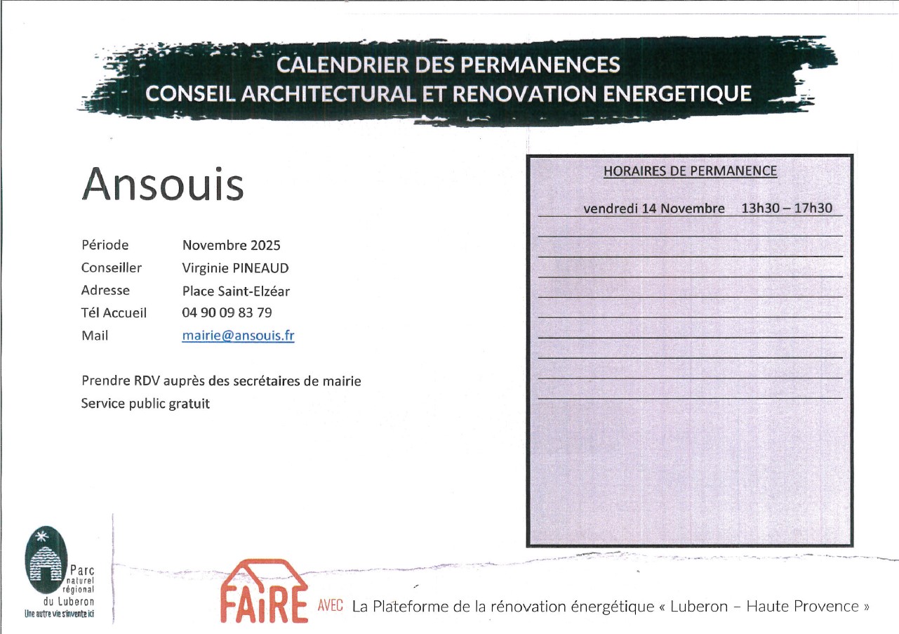 Sur rendez-vous à prendre en mairie, par téléphone au 04 90 09 83 79 ou par mail (–> mairie @ ansouis.fr).